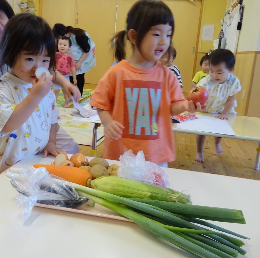 野菜に実際に触れる時間もあり、お子さんたちはたくさんの野菜に触れ【硬い】【柔らかい】【ざらざらする】など様々な感触を楽しむことができました!