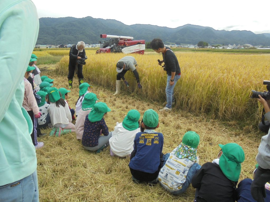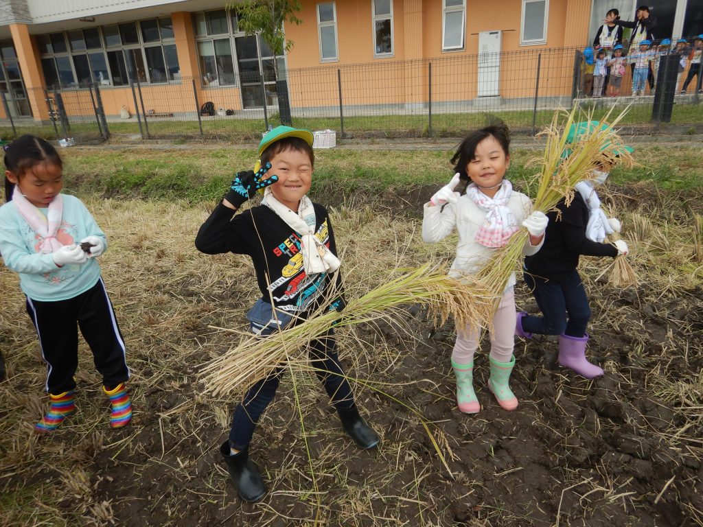 田んぼの稲の様子を日々観察し、「大きくなってきたね!」「もうすぐお米とれるかな~」と稲刈りの日を楽しみにしていたお子さん達です。