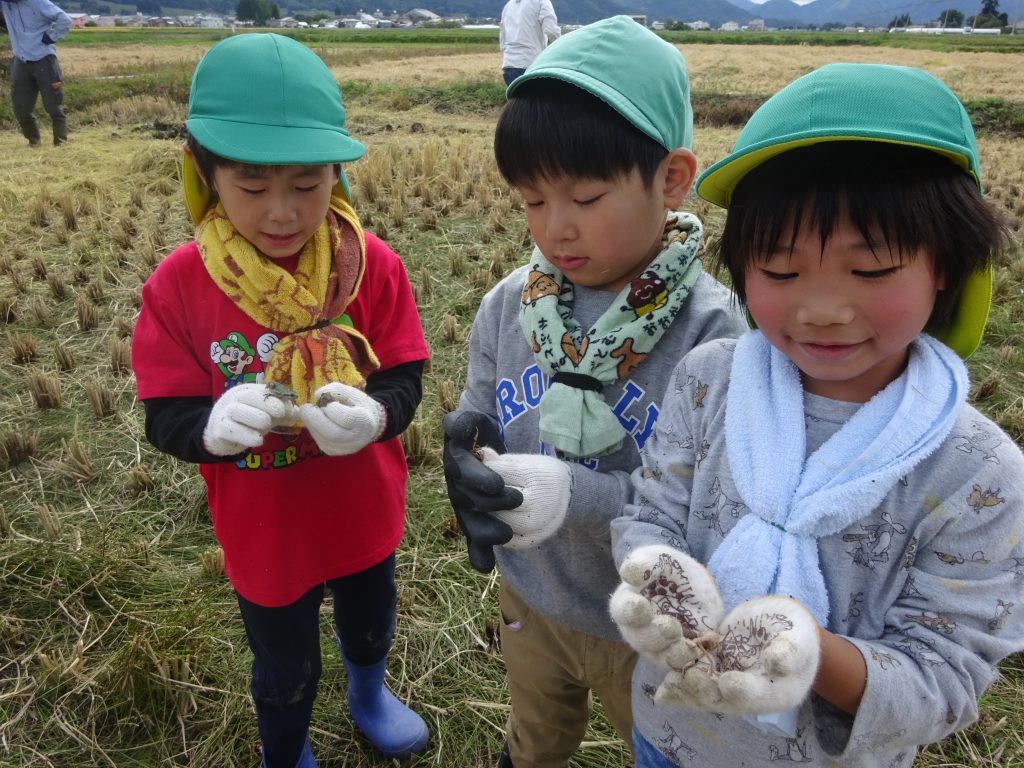 最後は、田んぼにいたカマキリやカエルを捕まえて観察しました。稲刈りが終わったので、田んぼにもいろいろな虫が出てきて、遊び場として活躍しそうです。今後の遊びも盛り上がりそうで楽しみです☆