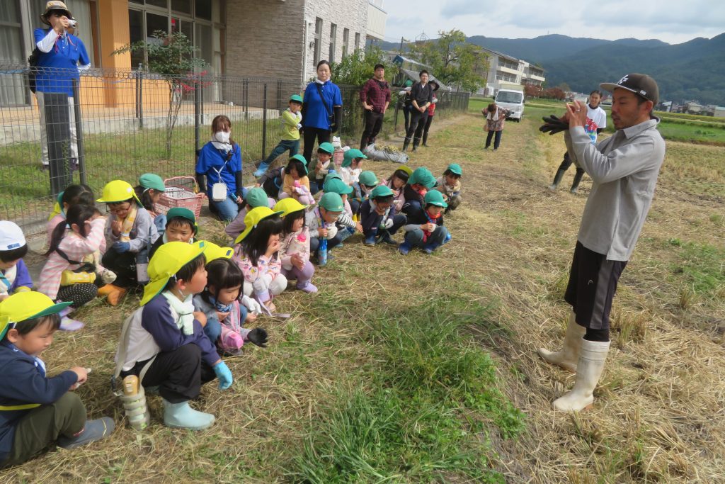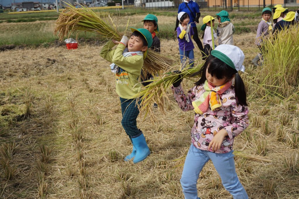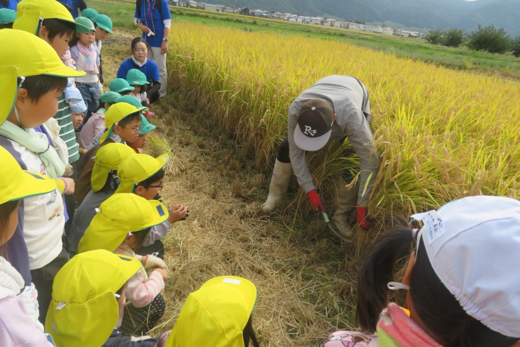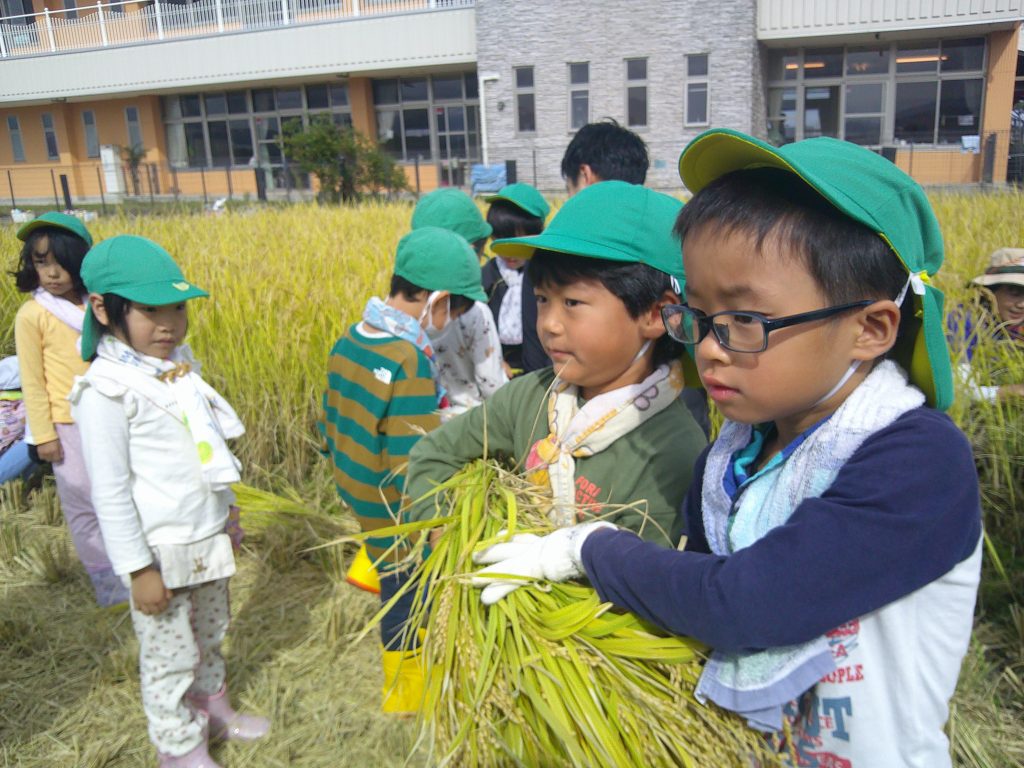 10月9日(木)は、天候に恵まれ、お子さん達が楽しみにしていた稲刈りを行いました。