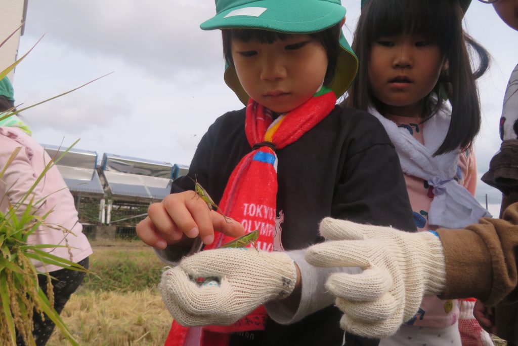 稲刈りを行っている中でたくさんの出会いがありました♪”カエル・バッタ・カマキリ・クモ・トンボ・チョウチョ・ゲジゲジ・アカハライモリ”等たくさんの虫を見つけ、大興奮!!手の中にたくさんのカエルを捕まえて嬉しそうな様子も見られました。捕まえた生き物たちは最後に田んぼに返し「バイバイ!」とお別れをしてきました。アカハライモリだけはどうしても育てたいと、園に持ち帰りみんなで育てることにしました。