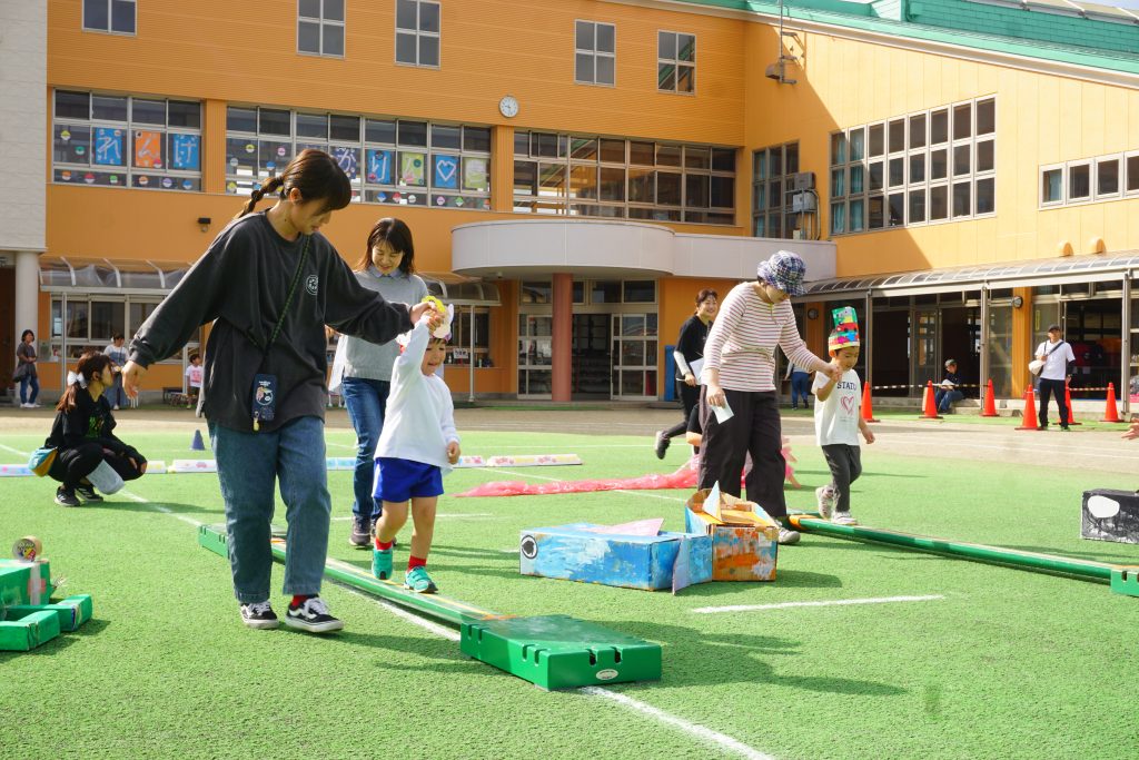 (4歳)親子で協力してモンスターボールを運びました☆ (5歳)バトンをつないで全速力で走ります!
