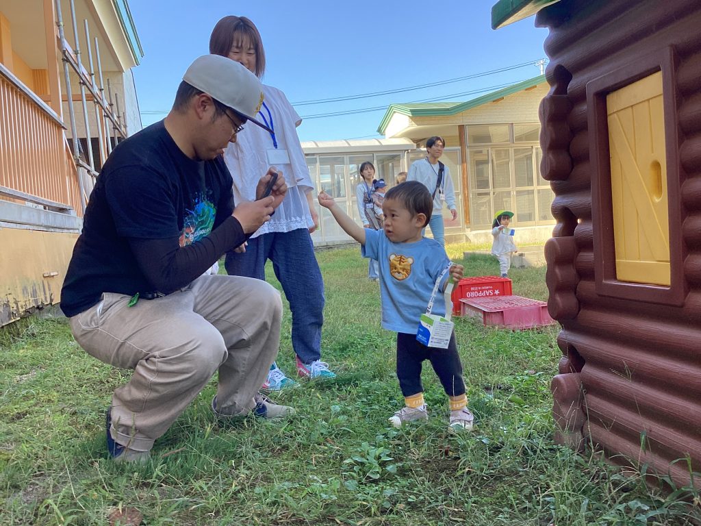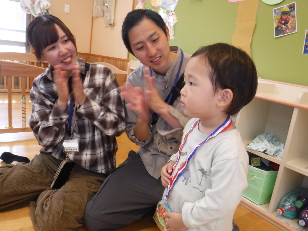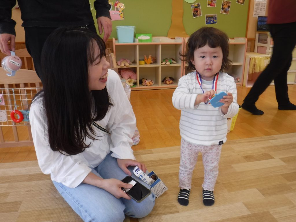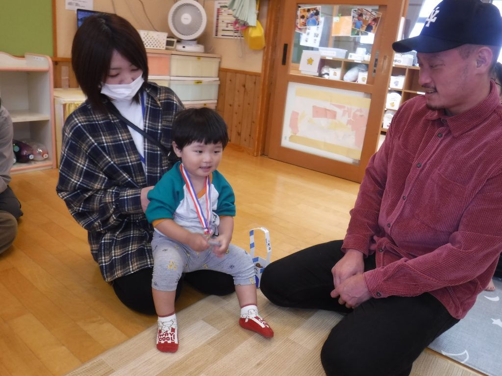 お問い合せ 各種資料一覧 1歳クラスひばり組 ファミリー参加デーを行いました♪ みなみ若葉 2025. 10.15 1歳クラスひばり組 ファミリー参加デーを行いました♪ 10月15日(水)、ひばり組のファミリー参加デーを行いました。 わくわく広場では、心地良いポカポカ陽気の中、砂遊びや秋の自然物拾い、滑り台など親子で一緒に楽しみました。 元気に身体を動かした後は、お子さんの大好きな手遊び・紙芝居を喜んで見ていました♪ 先生からアンパンマンのメダルをもらい、とても大喜び☆ 本日は、ファミリー参加デーにご参加いただきありがとうございました! 前のページ 一覧に戻る 次のページ