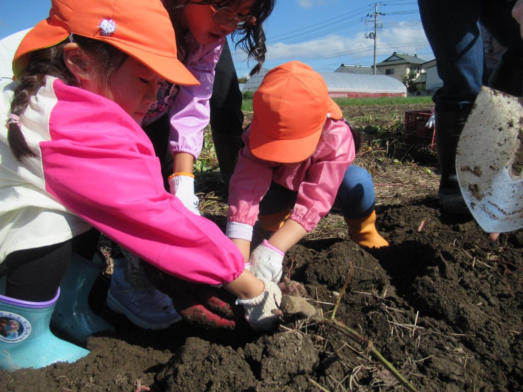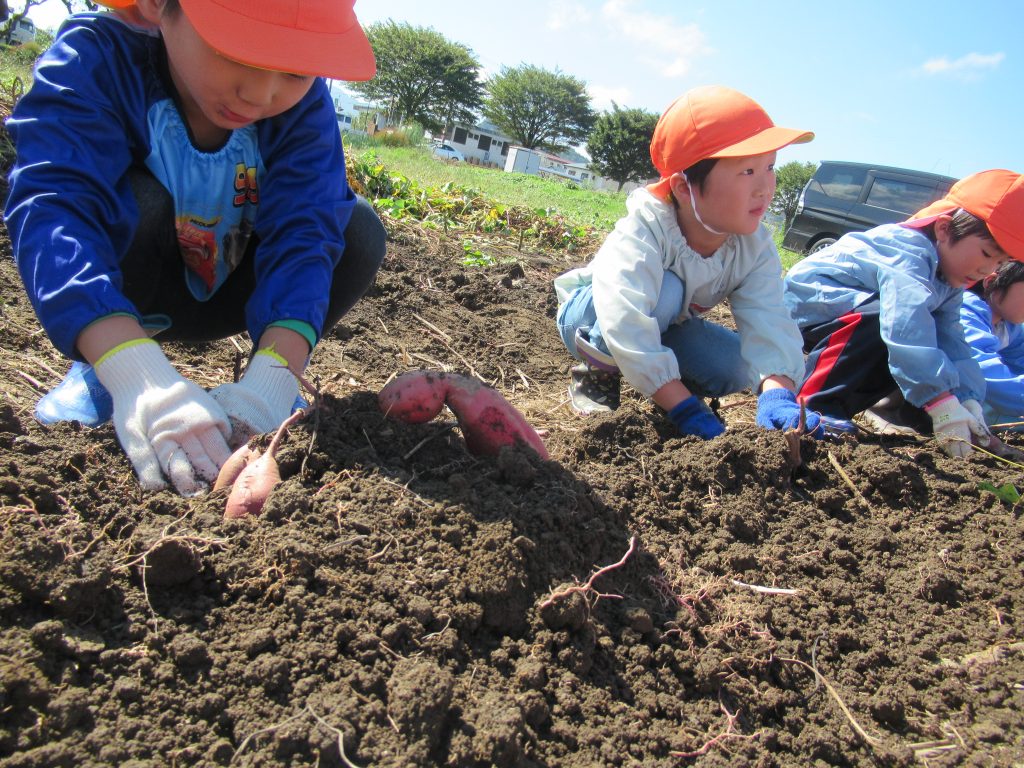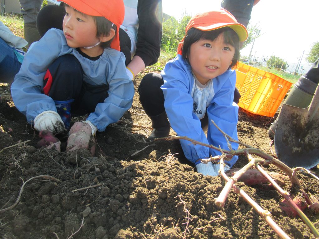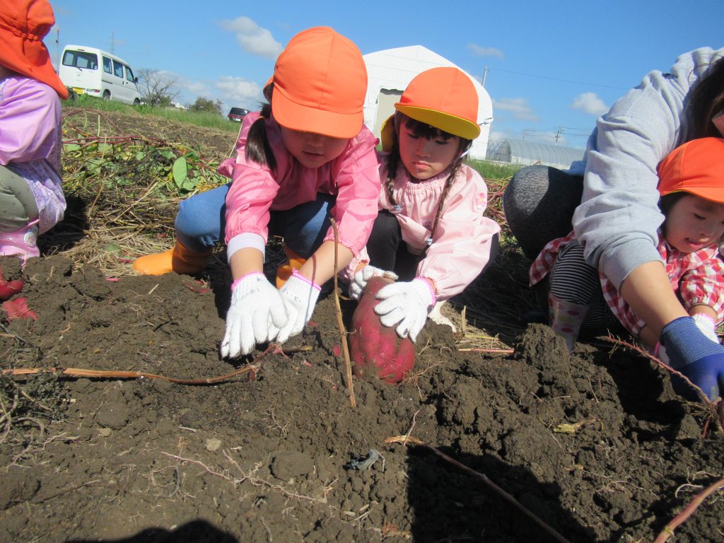 手でどんどん掘っていくと・・・「せんせい~すっごい大きい!」「誰か手伝って~!」と友達やお手伝いのお家の方と一緒に力を合わせて大きなさつまいもを沢山収穫できました☆
