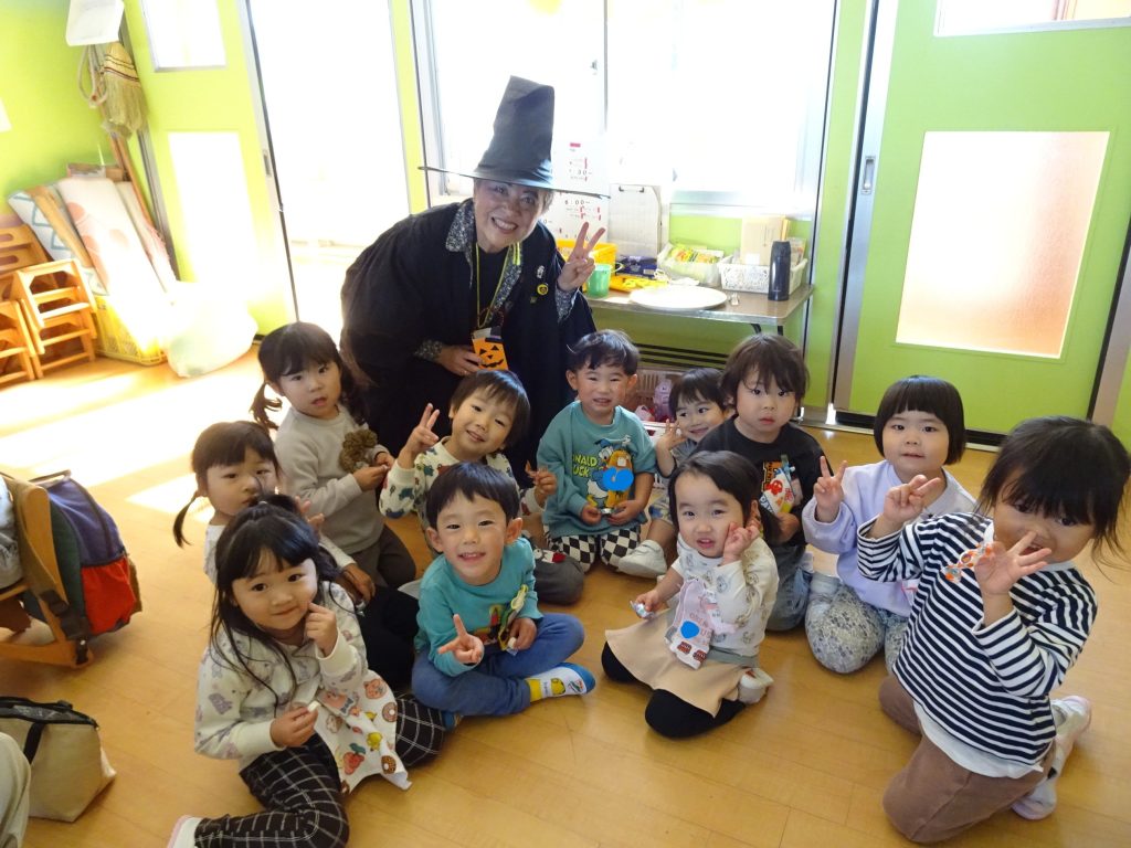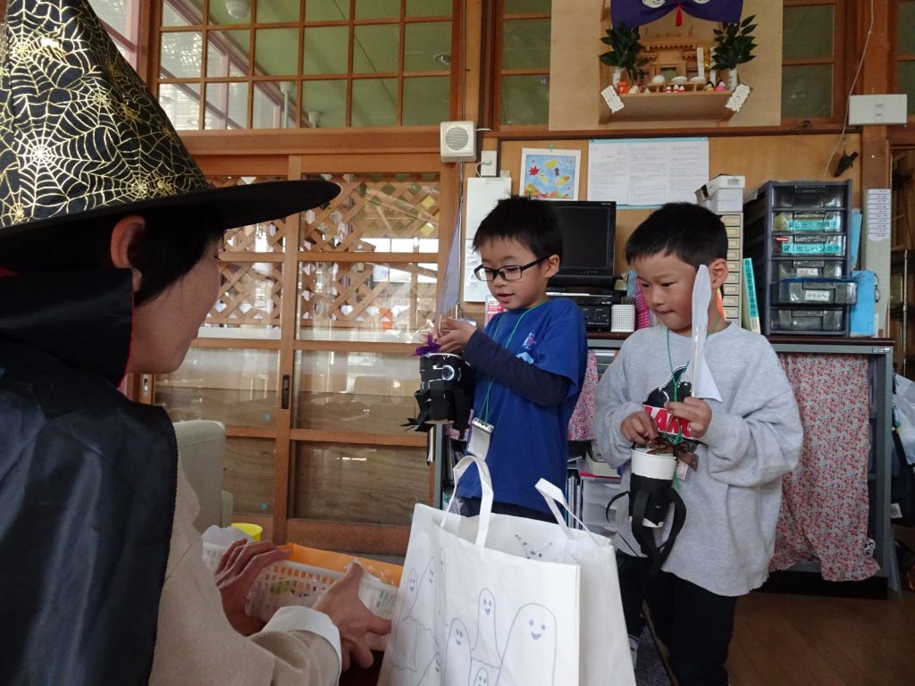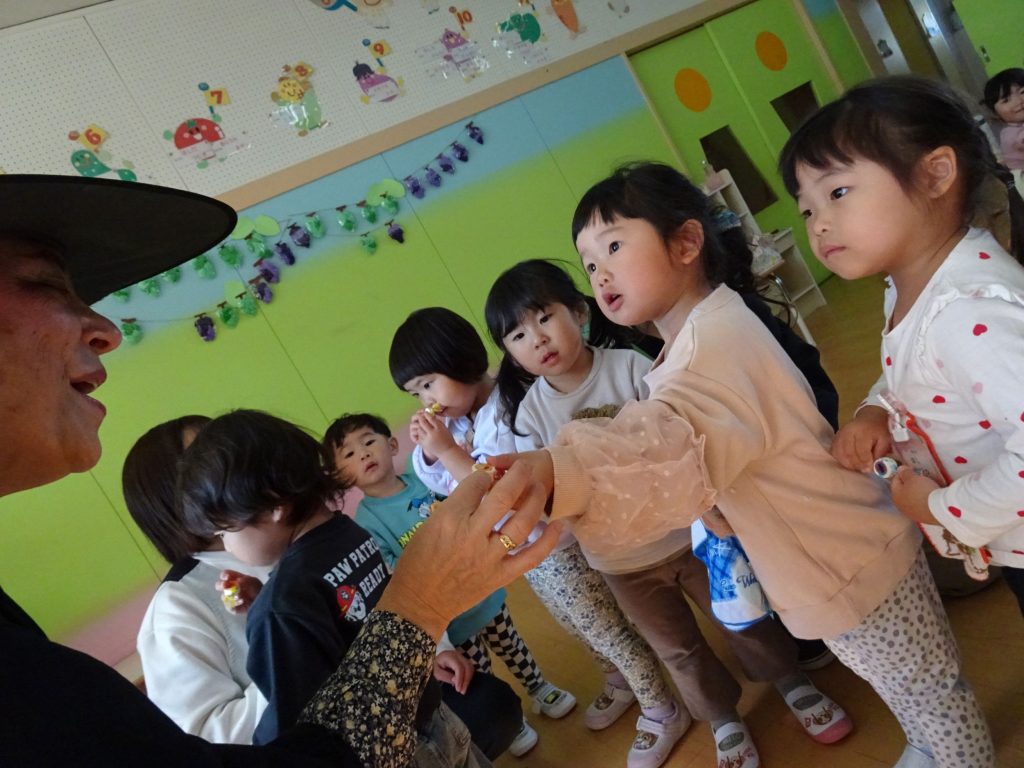 トロイ先生扮する魔女さんは、満3歳、3歳クラスにもラムネのプレゼント★お子さんたちはちょっぴり緊張しながらもお菓子をもらって「Thank you!!」と先生を真似て言っていました。とても楽しいハロウィンを過ごせました。