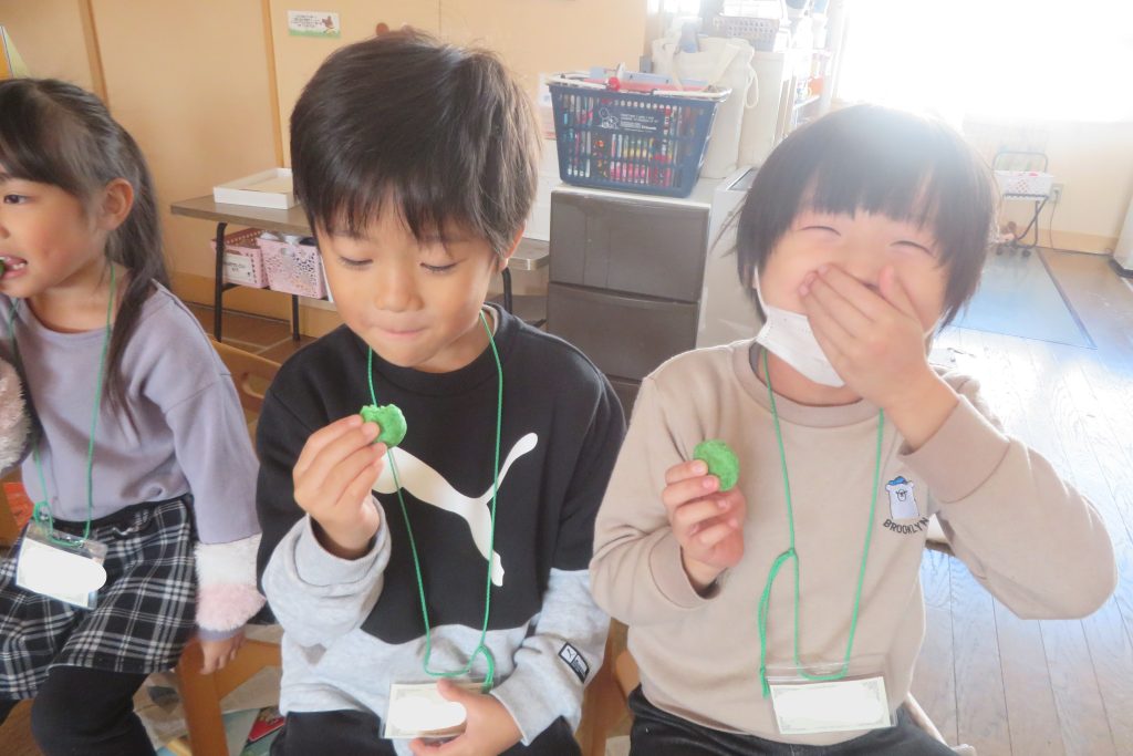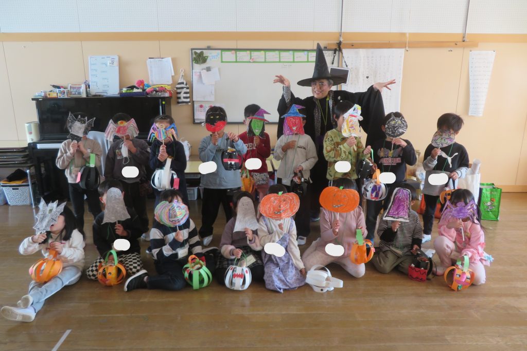 10月30日(木)の5歳クラスの英会話教室の時間にハロウィンごっこをしました。トロイ先生が小さいころ住んでいたカナダでは、ハロウィンの日に変装して「Trick or Treat(お菓子をくれないといたずらしちゃうぞ)」と言って近所の家を回ってお菓子をたくさんもらったという話を聞き、みんなも手作りのお面とバッグを作り、園内の魔女が隠れている色々なポイントへ「Trick or Treat」とお菓子をもらいに行きました。