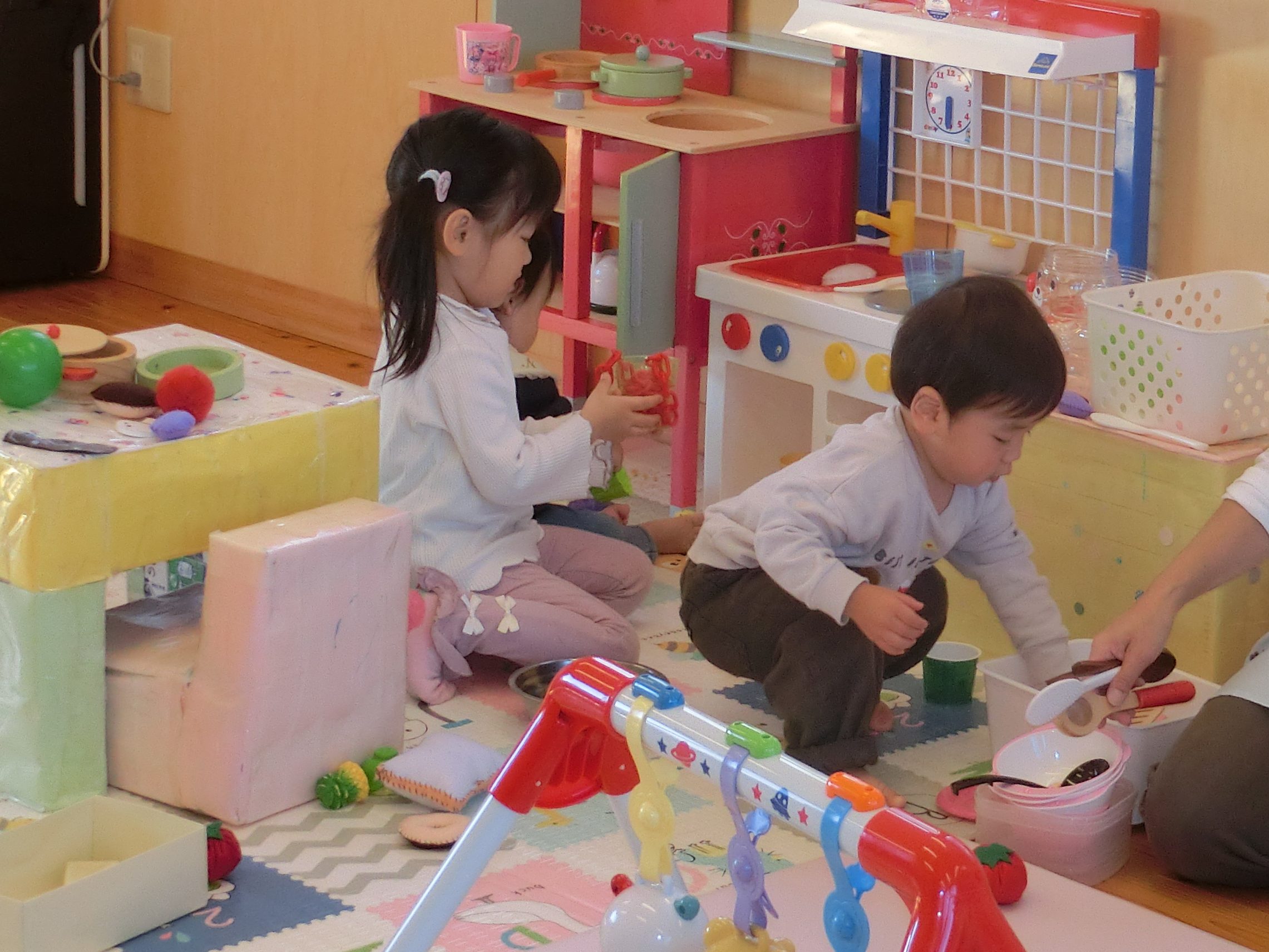お母さんが楽しく作っている間、お子さん達は子育て支援室で、先生と一緒に好きな遊びを楽しみました。