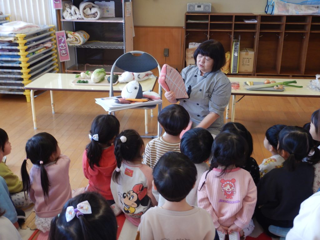 12月11日(木)に、いつも美味しい給食を作って下さるメフォスさんから、食べ物についてお話をして頂きました。