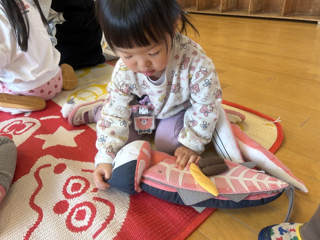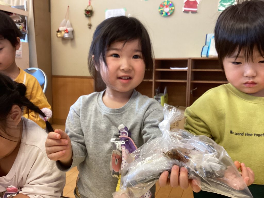 また、実際に、白菜やピーマン、カボチャ、ネギ、玉ねぎなどの野菜や、袋越しでイワシに触れたり、ちぎったり、潰したり...感触の違いを味わいました。