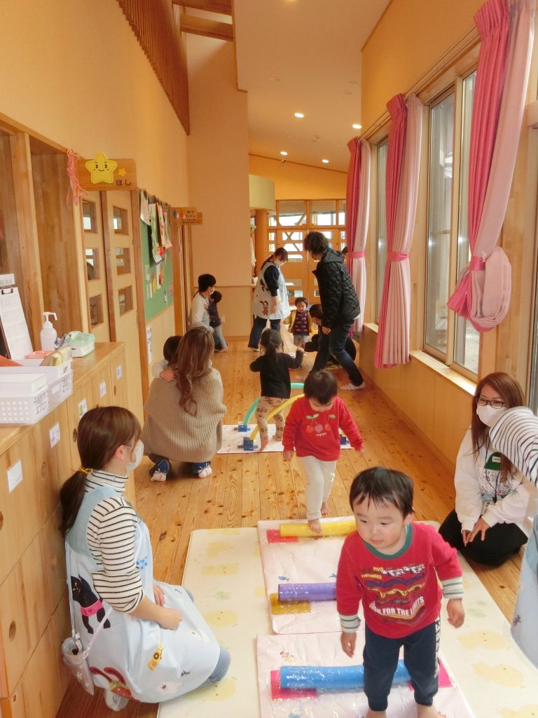 運動遊びでは、手作りのジャンプマットや平均台などに挑戦!!親子で「おっとっと!」とバランスをとりながら遊び、盛り上がっていました☆