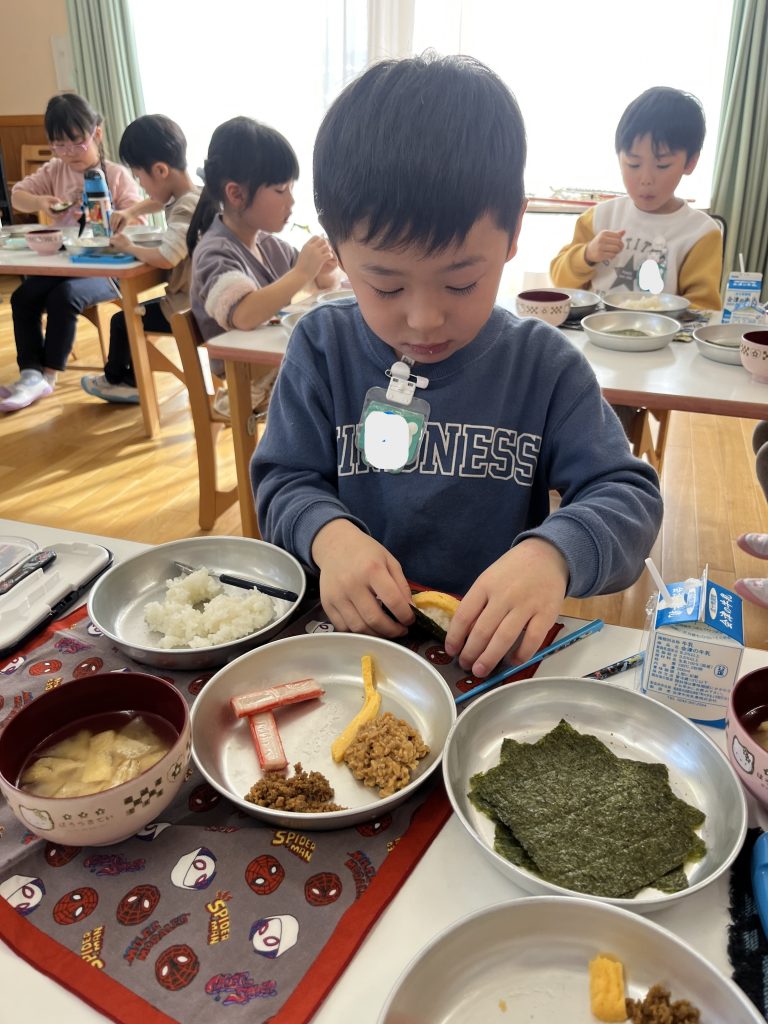 海苔の上に豪快にご飯と具材をのせるお子さん・・・
