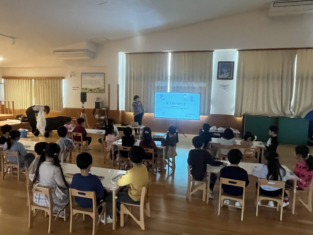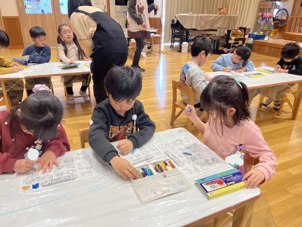 防災ぬり絵では、聞いた話を思い出しながら、災害時に準備しておいた方が良いものをそれぞれが考え、絵の中から選びました。最後に友達と話し合い、「これも大事だね」などの声も聞かれ、お子さん達の防災への意識も高まったようでした。