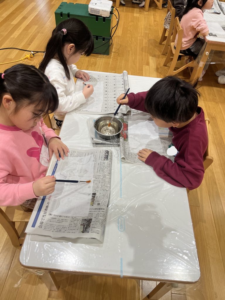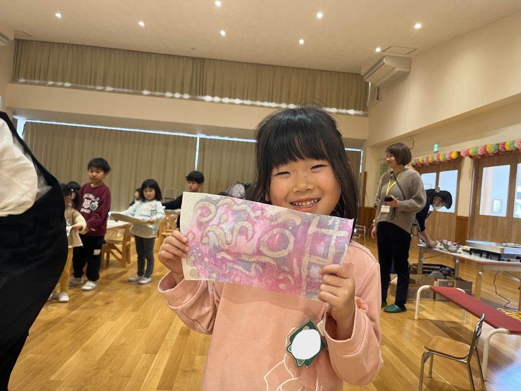 また、溶かしたロウを使って『ランタンシェイド』作りも体験しました。半紙にロウで好きな模様を描き、「見えないね」と話していたお子さん達ですが、色水を掛けるとロウが水をはじき、「綺麗!(模様)出てきたね!」と大興奮‼
