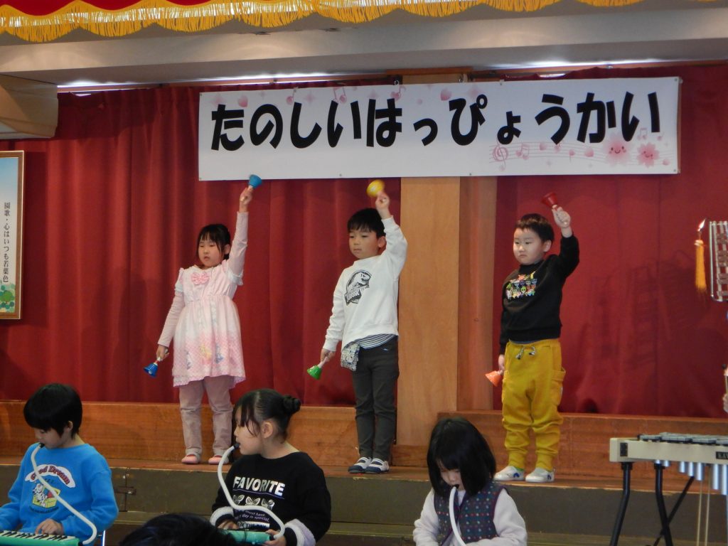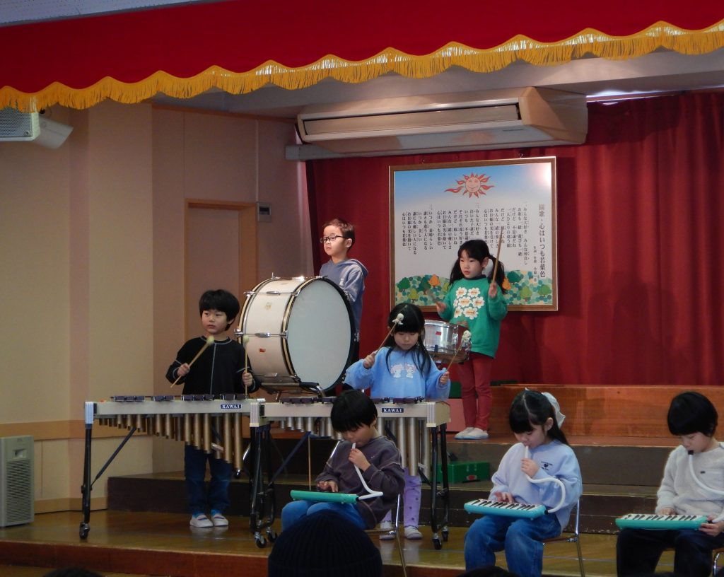 クラスごとに好きな曲で合奏を行いました。さくら組は「夢を叶えてドラえもん」を演奏し、もも組は「それもいいね」を演奏しました。鉄琴や木琴、ベルや鍵盤ハーモニカなど様々な楽器を使い、練習の成果を発揮し、みんなで気持ちを一つにして素敵な演奏になりました。お大好きなお家の方々に見てもらうことが出来て大満足なお子さん達でした。
