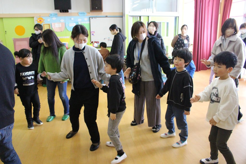 最後に親子で楽しくダンスをしました。「どろぼうねことねずみけいじ」という遊び歌では刑事と泥棒の役に分かれ、お家の方と勝負!!